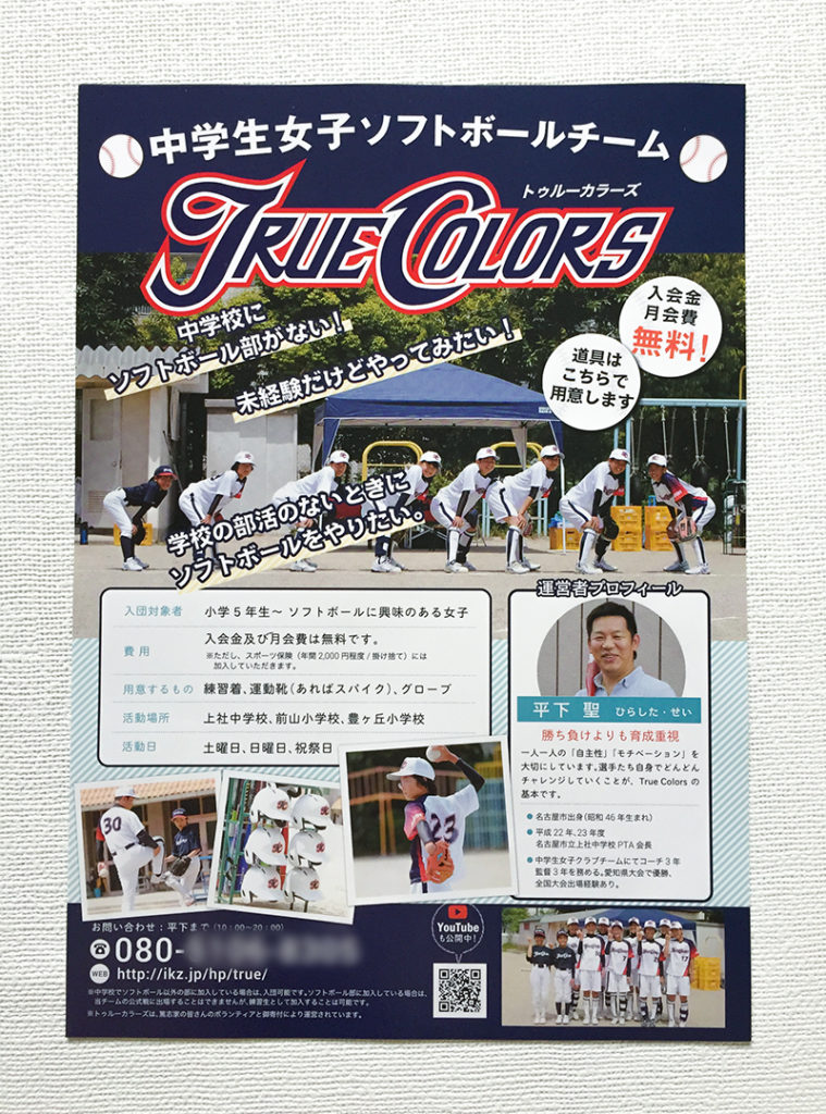 ソフトボールチームのチラシ カテゴリ 2018.06.282026.04.14 名東区の小中学生のソフトボールチーム 「トゥルーカラーズ」のチラシを作らせていただきました。(2回目です♪) 前回はチームができたばかりで写真がなかったのですが、今回はいい写真をたくさんご用意いただきました★ やっぱり写真が入ると違いますね(^_-)-☆