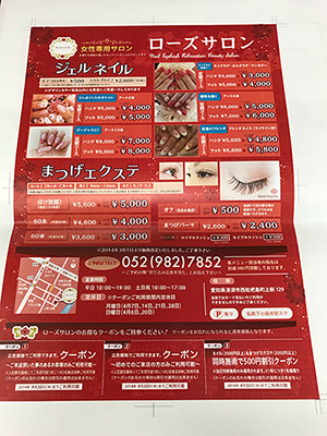 ネイルサロンのチラシを作らせて頂きました♪ カテゴリ 2018.10.122026.04.14 清須のネイル・マツエク・エステのローズサロン様のチラシを作らせていただきました。 ビフォーはこんな感じでした↓ 赤をやめて、カフェのメニューぽくしてほしいというご希望でした(*^.^*)