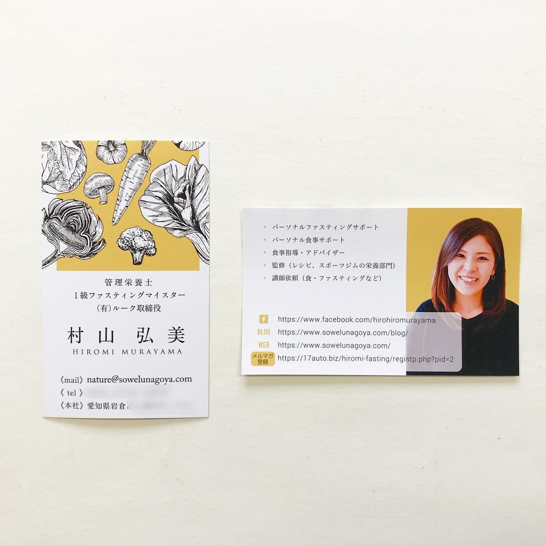 管理栄養士・ファスティングマイスターさんの名刺。 飲食店・カフェ・食品 2018.10.252026.04.14 管理栄養士・ファスティングマイスターさんの名刺を作らせて頂きました。 食のプロフェッショナルとして、品があり、かつ明るく、わかりやすいを意識してデザインしました。 またこの名刺のように、裏表でタテヨコが違うデザインは、向きに気をつけて印刷データを作ります。 基本的には右手で持って、裏返した時に自然な向きになるように(^0^)