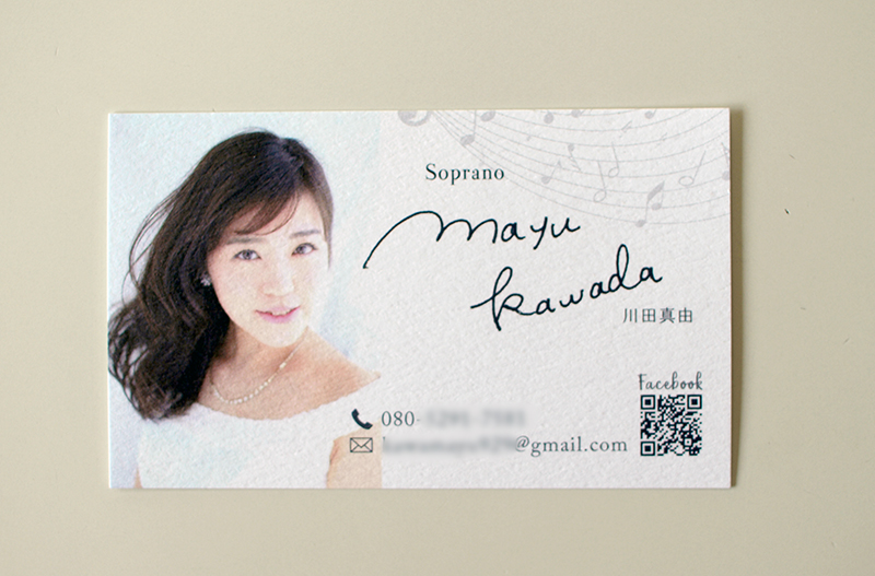 ソプラノ歌手さんの名刺 名刺 2019.01.172026.04.14 音楽家シリーズ・音大生さんシリーズ第7弾!(多分) 愛知県芸術大学から近いからか、みなさんネットで見つけてくださり、よく注文をいただきます。 今回は声楽科、ソプラノ歌手さんの名刺です。 キーワードは透明感★ ご本人の手書きの名前入りです。(その場で書いてもらいました。上手!) ↓裏面 紙はスコットランドという画用紙みたいな質感で人気の用紙です。 イベントに間に合うようにということで、ドキドキでしたが無事間に合いました! その他の音楽家さんの名刺や、コンサートのチラシなど、音楽関係のデザイン実績はコチラ♬