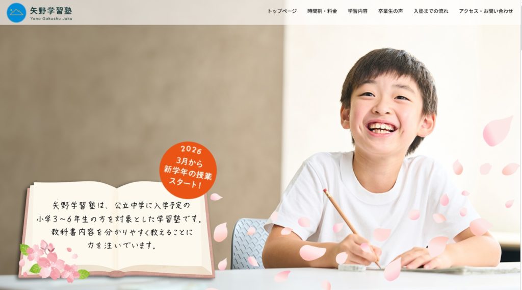 日進市の学習塾のホームページ制作 WEB制作 2024.12.282026.04.10 日進市の学習塾、矢野学習塾さんのホームページを作らせていただきました。 以前チラシデザインのご依頼からはじまり、仕上がりを気に入って頂き、その後ホームページもご依頼いただきました。 今までチラシだけで宣伝していて、ずっとホームページが欲しかったとの事で、大変喜んで頂けました。 優しく丁寧な先生の人となりが伝わるよう、柔らかく明るい雰囲気で制作しました。 原稿でいただいた先生の字がとてもきれいでしたので、ホームページにも取り入れたく、ところどころに先生の手書き文字を入れました。 矢野学習塾のホームページ