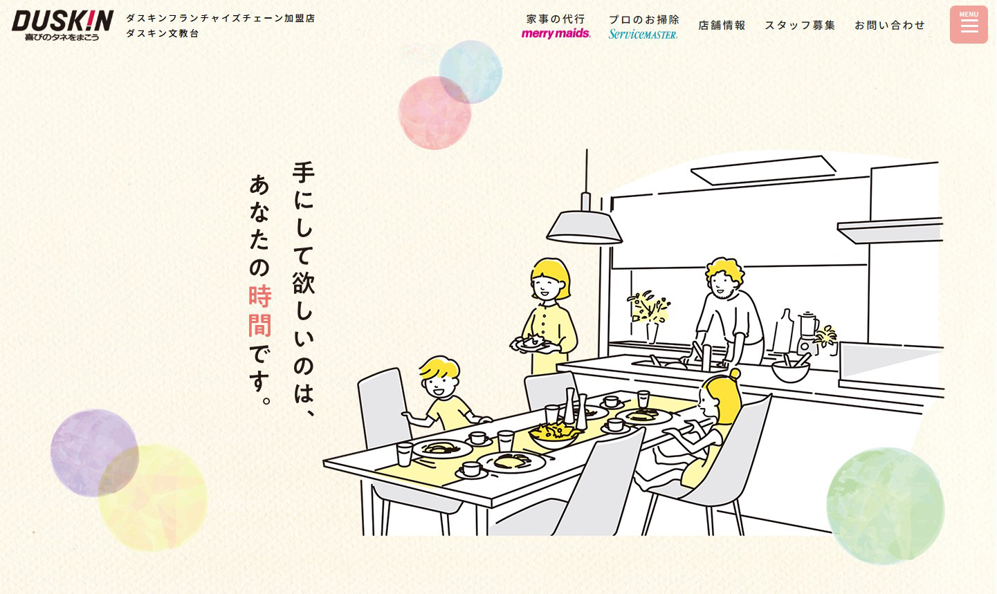 ダスキンさんのホームページリニューアル WEB制作 2025.07.012026.04.08 ダスキン文教台店さんのホームページをリニューアルさせていただきました。 明るくやわらかな雰囲気で、かつサービスメニューと価格が分かりやすく伝わるよう心掛けました。 ダスキン文教台店のHP