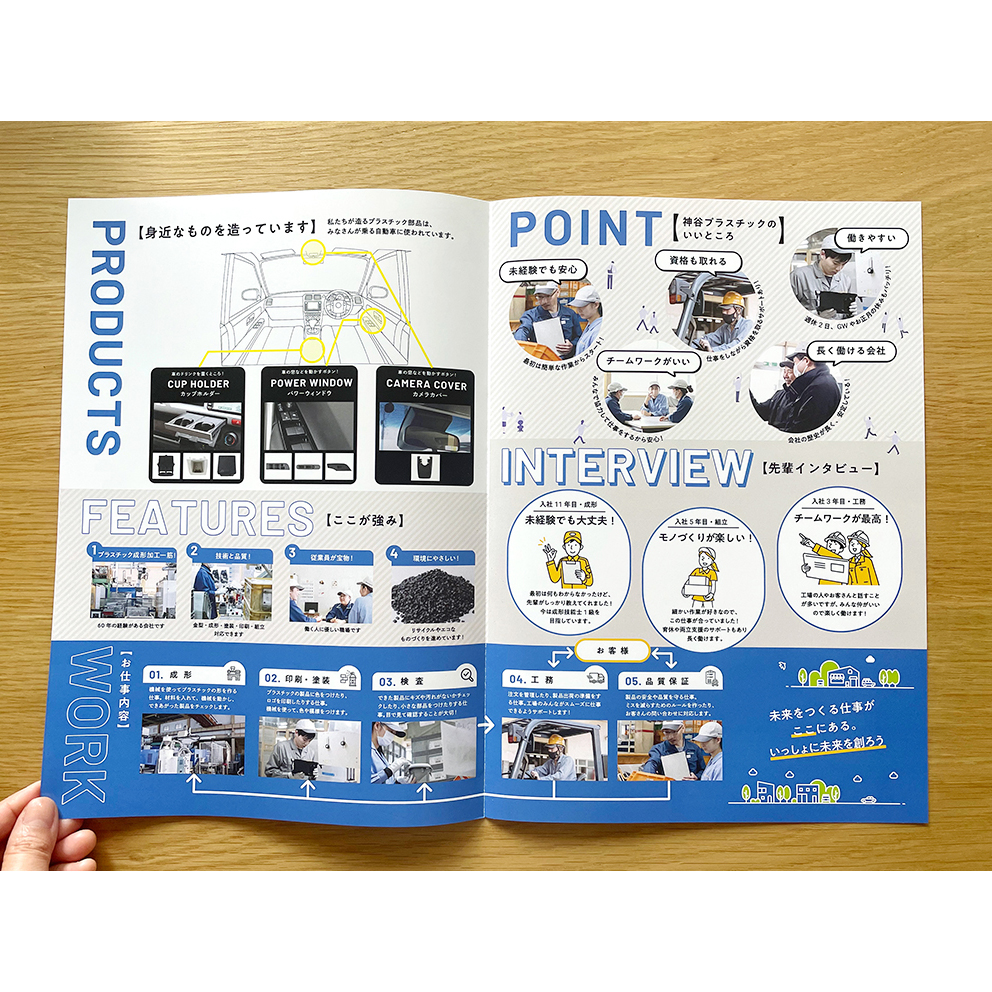 自動車部品メーカーの採用向け会社案内 パンフレット 2025.07.072026.04.08 豊田市の自動車部品メーカー株式会社神谷プラスチックさんの採用向け会社案内を作らせていただきました。 ホームページもつくりました。 豊田の自動車部品メーカのホームページ豊田の自動車部品メーカー株式会社神谷プラスチック様ホームページ作らせていただきました。動画撮影・編集写真撮影も。商品紹介のページで一つの画像の中の任意の場所をクリックすると、それぞれ別の内容の小窓が開くようにし、かつスマホでも同じ動きになる