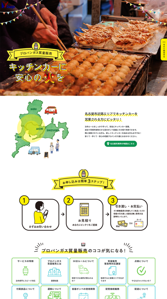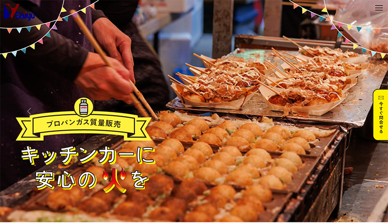 プロパンガス販売のサイト制作 WEB制作 2025.10.012026.04.08 プロパンガスのレンタル・販売を手掛ける名古屋の大雄株式会社さん 専用サイトを作らせていただきました。 主にキッチンカーを出店する人たちに向け、ポップで分かりやすい雰囲気にしました。 プロパンガス販売のサイト