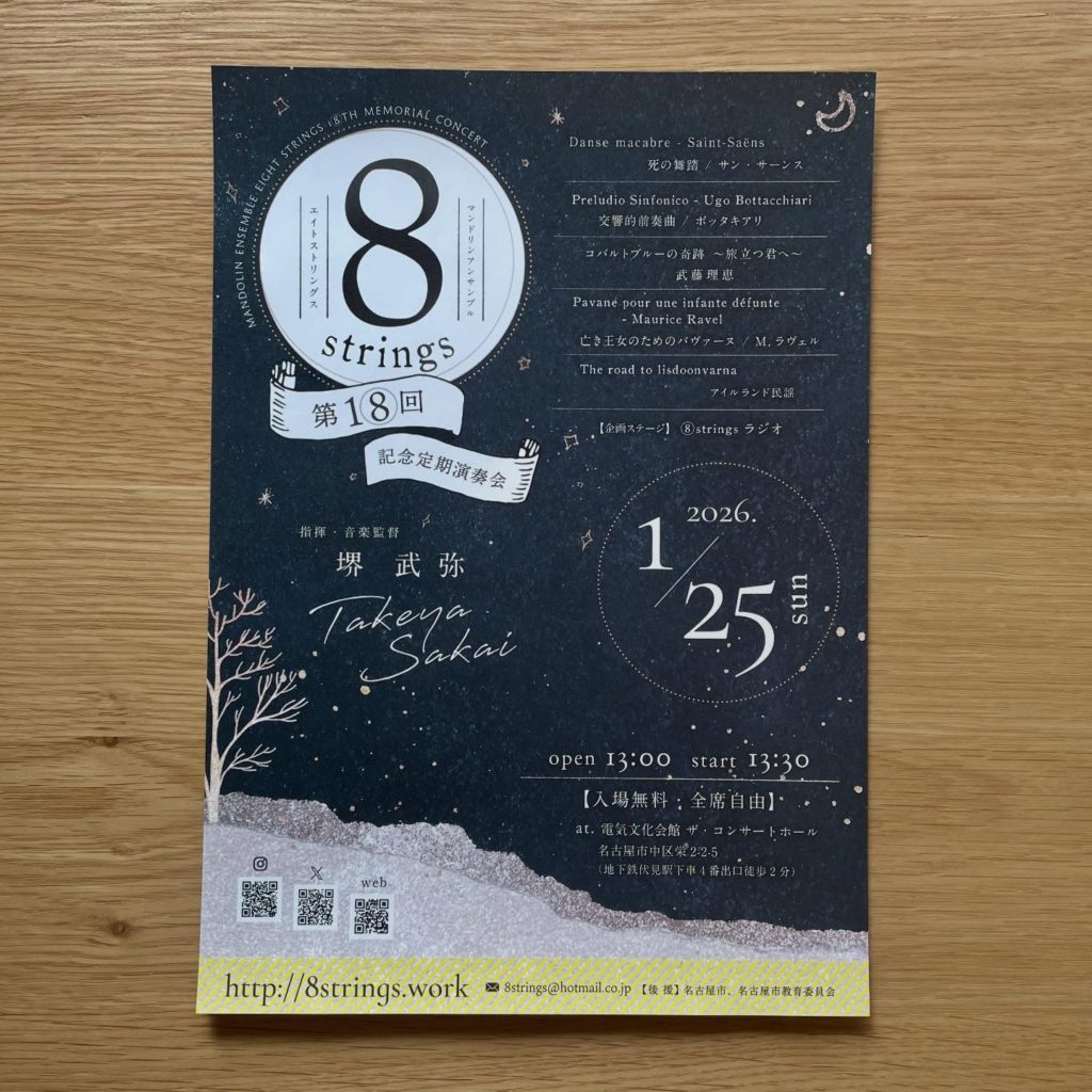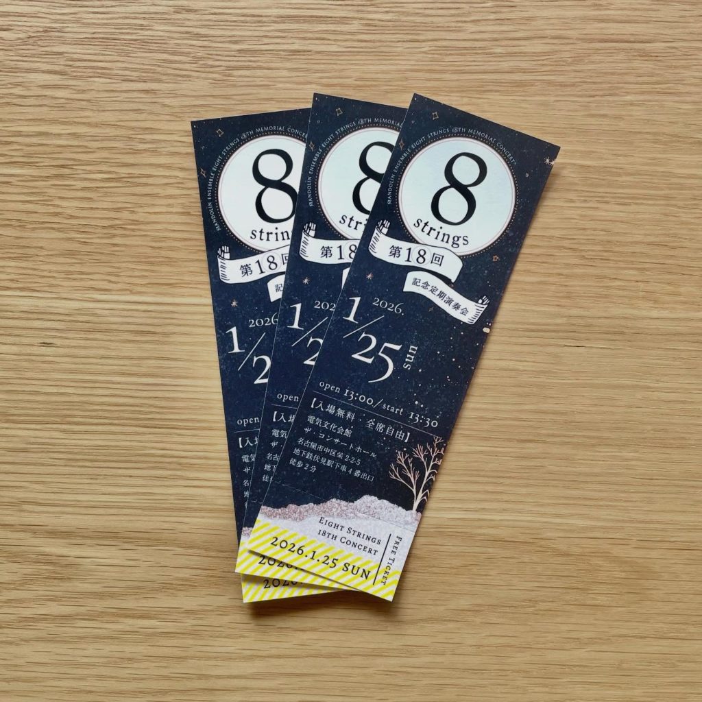 演奏会・コンサートのチラシ、チケット、プログラム。 制作実績 2026.01.302026.04.08 ご希望のコンセプトに基づいて、統一感あるデザインでお作りします。 目次 チラシチケット チラシ 今回は折らずに持って帰りやすい、コンパクトなA5サイズです。 チケット ミシン目が入っています。 ポスターや各種物販グッズもお気軽にご相談下さい。