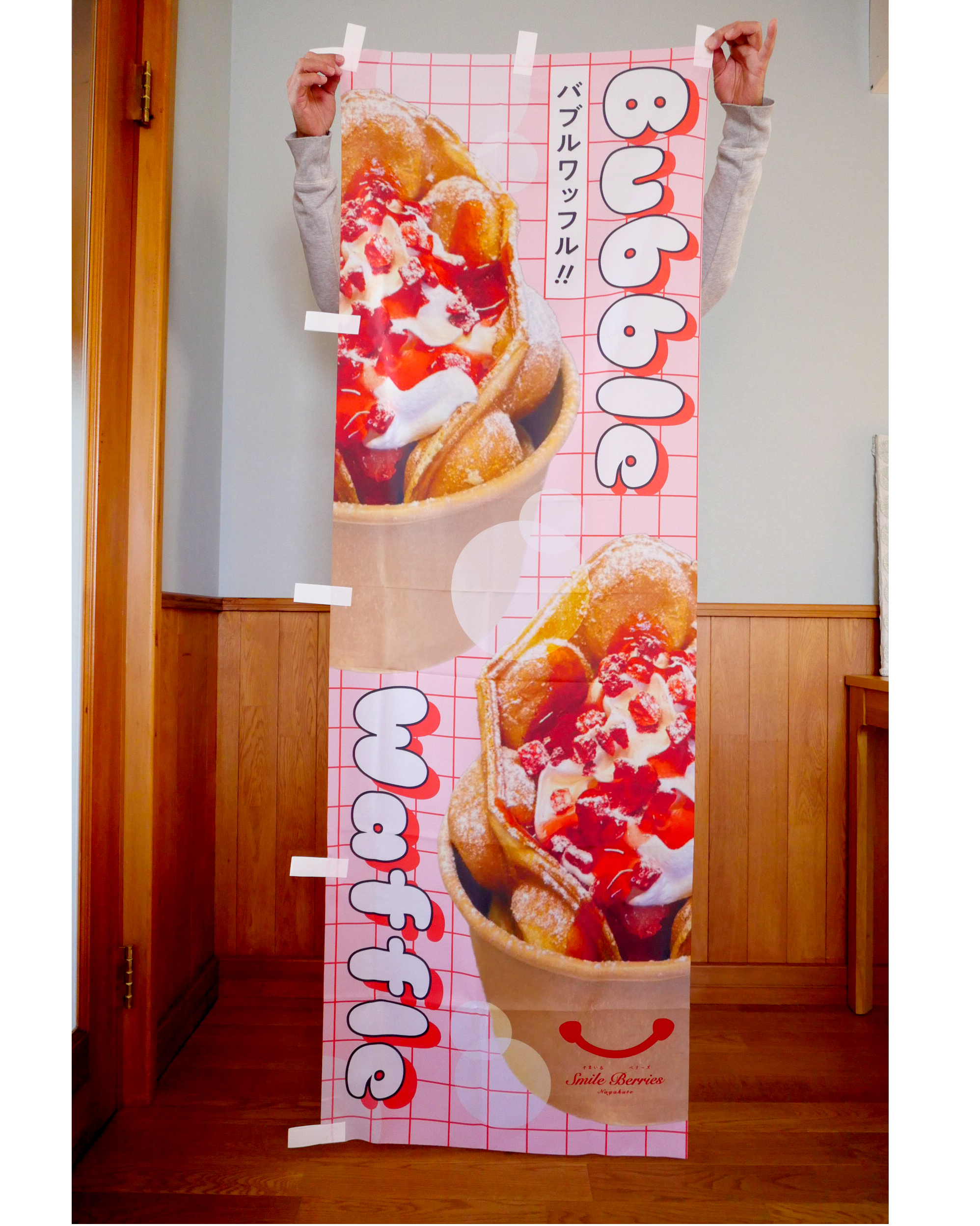 いちごスイーツの「のぼり」デザイン 制作実績 2026.02.192026.04.08 すまいるベリーズ長久手さんの、新作いちごスイーツののぼりです。ポップで元気な感じにしてみました。大きさは標準サイズ(600×1800m)