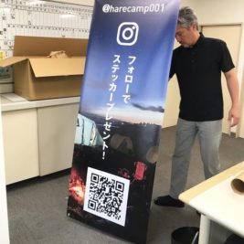 自立式のスタンドバナーです。軽くて持ち運びも組み立ても簡単!発色もきれい展示会やイベントに、お店にもオススメです後ろはこんな感じ。水を入れて重くできます。ひっかけるだけで簡単設置。