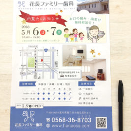 チラシ 春日井の歯医者さんのオープンチラシ 春日井に明日開院する、花長ファミリー歯科さんのチラシを作らせていただきました。B4サイズです。全部で13,000部!このあと折込センターに直接持って行きました。腰痛注意! 2018.05.07 チラシ医療・介護