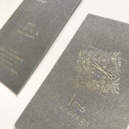 大工さんの名刺です。木を扱う仕事なので、木目の背景に道具のイラスト。一部にキラリンっと金箔加工を施しました。