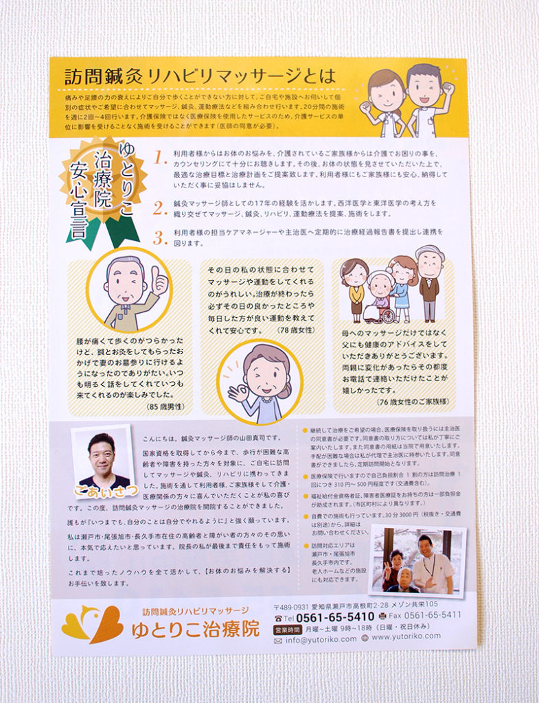 チラシ医療・介護 訪問介護のチラシ チラシ 2017.10.27 訪問鍼灸リハビリマッサージのチラシを作らせていただきました(^0^) 最初に頂いた原稿はもっと文字が多かったのですが…もっとシンプルに、一瞬で特徴が手に取った人に伝わるよう、構成を練り直し、こちらからも提案させていただきました。 伝えたいことはあるけど、どう見せたらよいかわからない。。。 安心してください!ほとんどの方がそうです。そして、それを考えるのが私たちの仕事です! まずはご相談ください(^0^) この記事を元に問い合わせる 必須お名前 必須メールアドレス ※携帯キャリアメール(@docomo.ne.jpなどドコモ・ソフトバンク・auのメールサービス)は届かない可能性があるので、なるべく他のアドレスでお送りください。3日以上返信が無い場合はお手数ですがお電話ください。 必須電話番号※メールが届かない場合おかけすることがございます。 任意住所※市区町村まででもOKです。 任意会社名・屋号 任意職種 必須お問い合わせ内容 ※確認画面は出ません。そのまま送信されますので、よくご確認の上送信ボタンを押してください。 ※不具合などで送れない場合は、お手数ですが info@nagakute-design.comまたは090-6363-6760(深谷)まで連絡下さい。