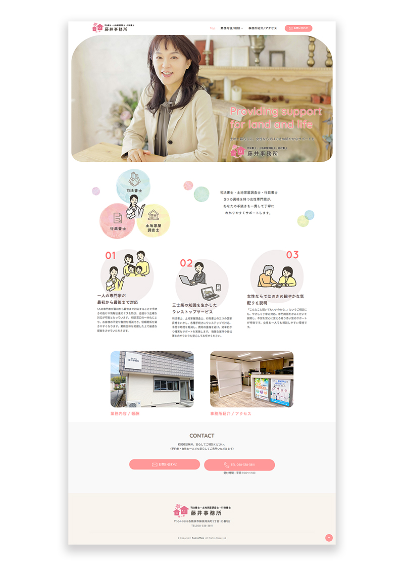 WEB制作司法書士・税理士など士業 WEB新規制作 各務原市の司法書士事務所のホームページ WEB制作 2025.11.112025.11.18 岐阜県各務原市の司法書士・行政書士事務所・土地家屋調査士を手がける 藤井事務所さん ホームページを作らせていただきました。 安心感・柔らかさが伝わるデザインを目指しました。 藤井事務所 HP この記事を元に問い合わせる 必須お名前 必須メールアドレス ※携帯キャリアメール(@docomo.ne.jpなどドコモ・ソフトバンク・auのメールサービス)は届かない可能性があるので、なるべく他のアドレスでお送りください。3日以上返信が無い場合はお手数ですがお電話ください。 必須電話番号※メールが届かない場合おかけすることがございます。 任意住所※市区町村まででもOKです。 任意会社名・屋号 任意職種 必須お問い合わせ内容 ※確認画面は出ません。そのまま送信されますので、よくご確認の上送信ボタンを押してください。 ※不具合などで送れない場合は、お手数ですが info@nagakute-design.comまたは090-6363-6760(深谷)まで連絡下さい。