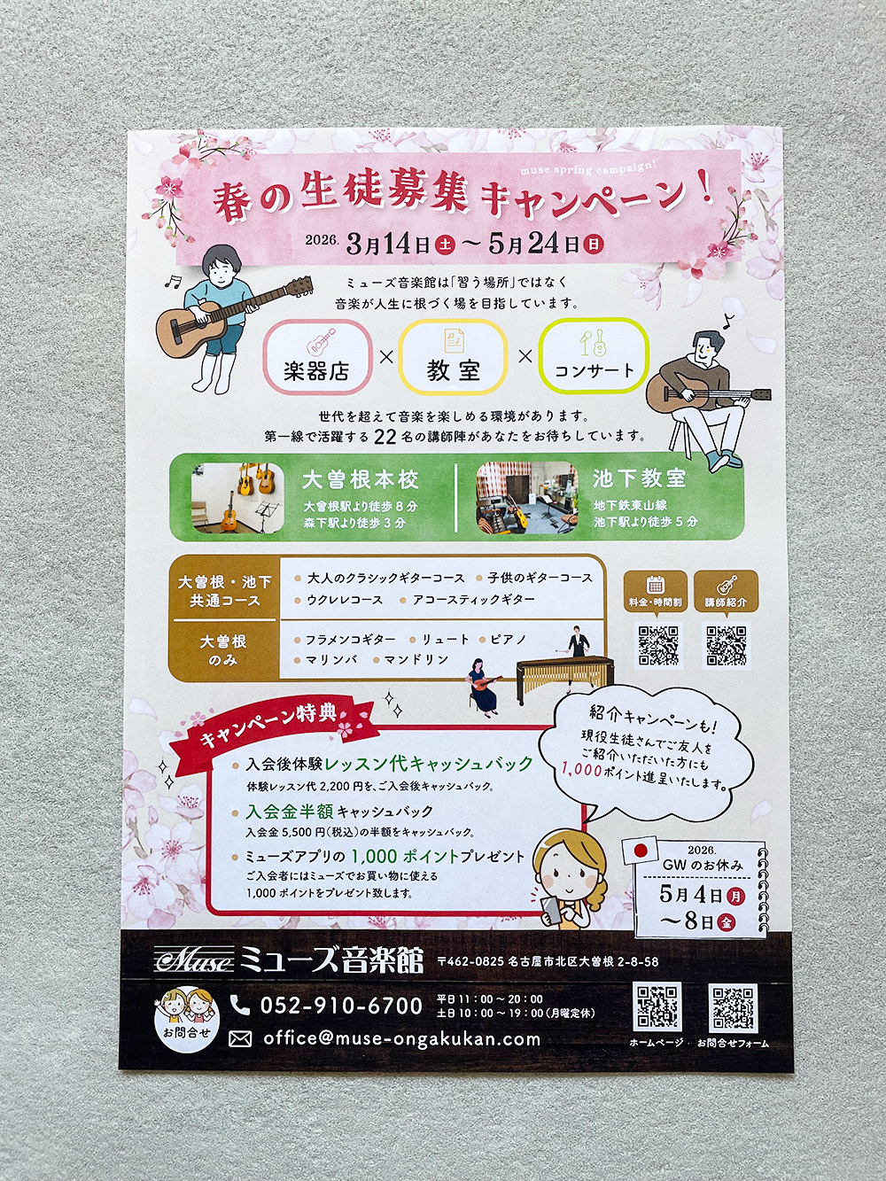 ショップ・スクール・教育チラシ芸術・文化 音楽教室の生徒募集チラシ ショップ・スクール・教育 2026.03.13 名古屋の音楽教室 ミューズ音楽館さん生徒募集チラシを作らせていただきました! この記事を元に問い合わせる 必須お名前 必須メールアドレス ※携帯キャリアメール(@docomo.ne.jpなどドコモ・ソフトバンク・auのメールサービス)は届かない可能性があるので、なるべく他のアドレスでお送りください。3日以上返信が無い場合はお手数ですがお電話ください。 必須電話番号※メールが届かない場合おかけすることがございます。 任意住所※市区町村まででもOKです。 任意会社名・屋号 任意職種 必須お問い合わせ内容 ※確認画面は出ません。そのまま送信されますので、よくご確認の上送信ボタンを押してください。 ※不具合などで送れない場合は、お手数ですが info@nagakute-design.comまたは090-6363-6760(深谷)まで連絡下さい。